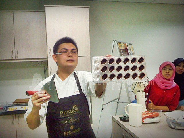 Chef Ah Meng ialah tenaga pengajar yang menunjukkan demo pada hari itu. Orangnya peramah, lawak dan tidak kedekut ilmu. Amatlah mesra alam...Selain menunjukkan cara membuat kek dan biskut, beliau juga menunjukkan cara membuat coklat dengan menggunakan produk ini. Nampak mudah je buat coklat ni (bilalah nak cuba ye). Chef Ah Meng ni memang baik hati sebab sudi berkongsi ilmu dengan kami semua. Antara menu yang kami pelajari ialah Kek Lapis Surabaya, Almond London, Pineapple Praline dan Deli Choc.